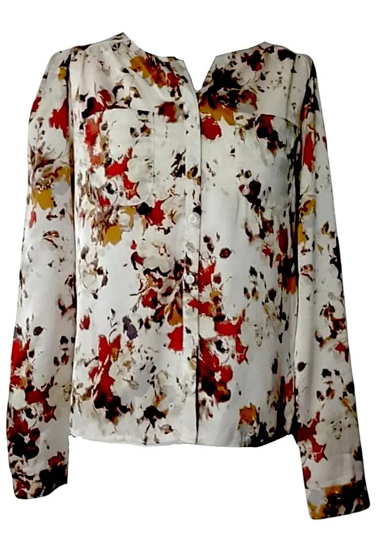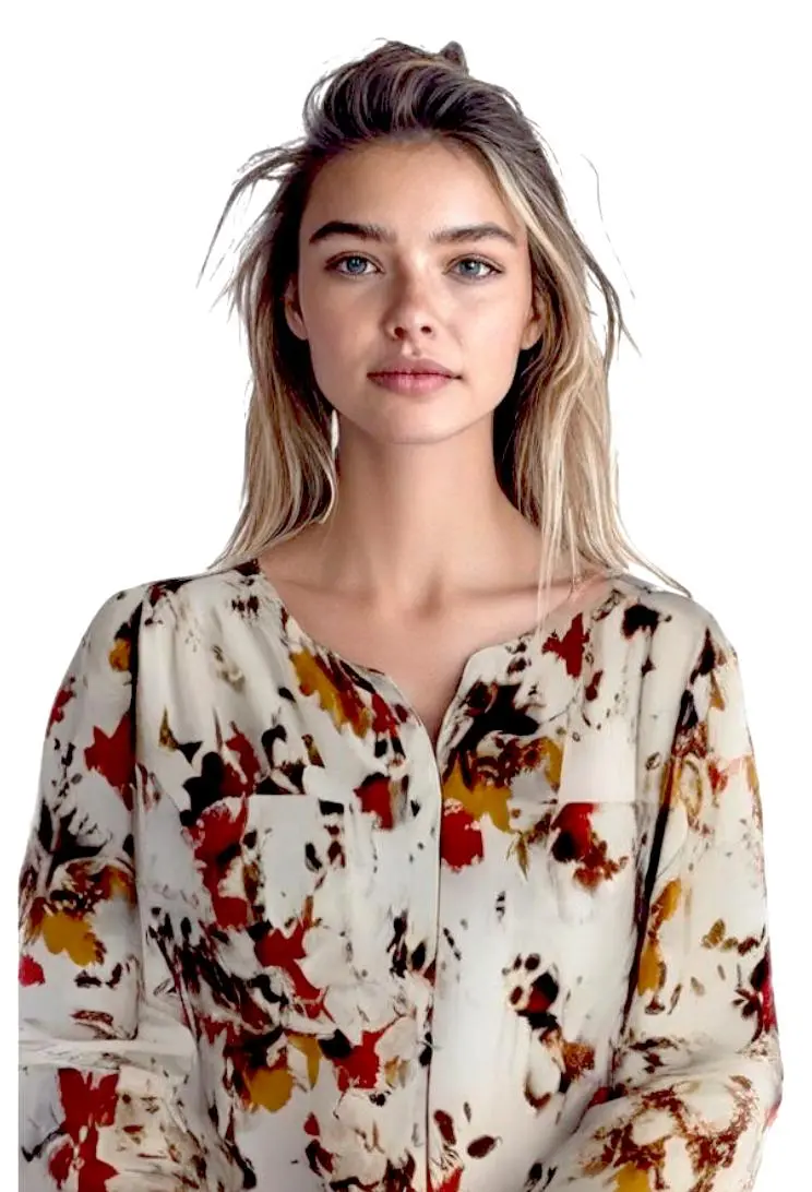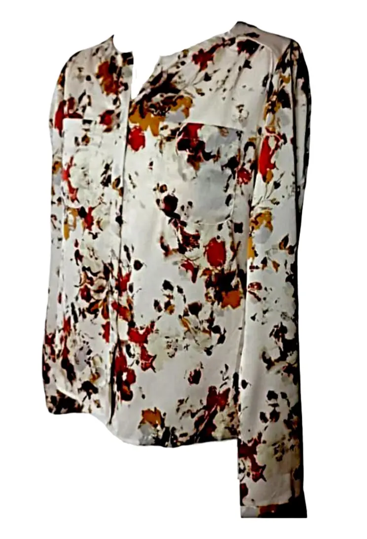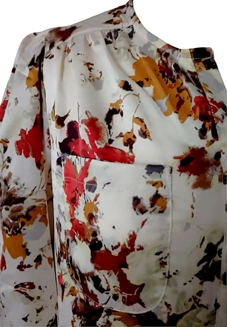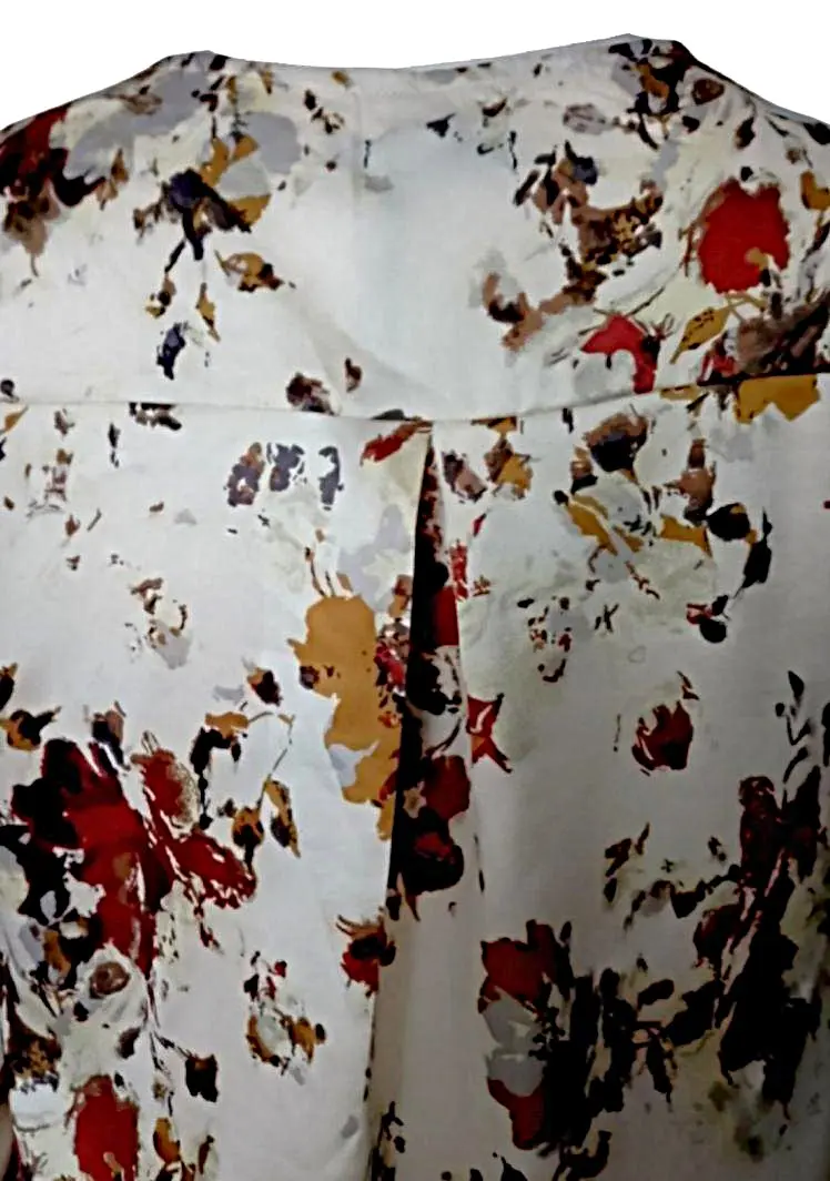 Découvrez notre chemisier beige en matière très légère polyester et viscose avec un imprimé floral corail et bordeaux. Ce modèle raffiné possède deux poches plaquées sur la poitrine et un pli au milieu du dos. Les manches sont fermées avec une patte à bouton blanc.